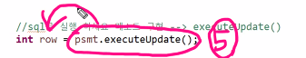 5.psmt에 있는 객체를 통해 executeUpdate 메소드 호출 => 바뀐 행의 수 반환