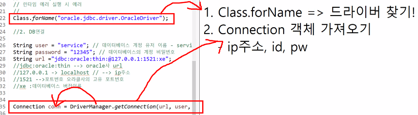 드라이버 매니저에 있는 커넥션의 url,user~~등등 가져와서 커넥션 타입의 객체인 conn에 저장된다.