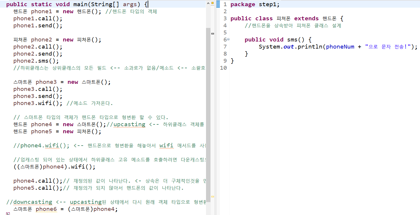 phone4와 phone5는 upcasting인 하위클래스에서 상위클래스로 올라가는 것이고